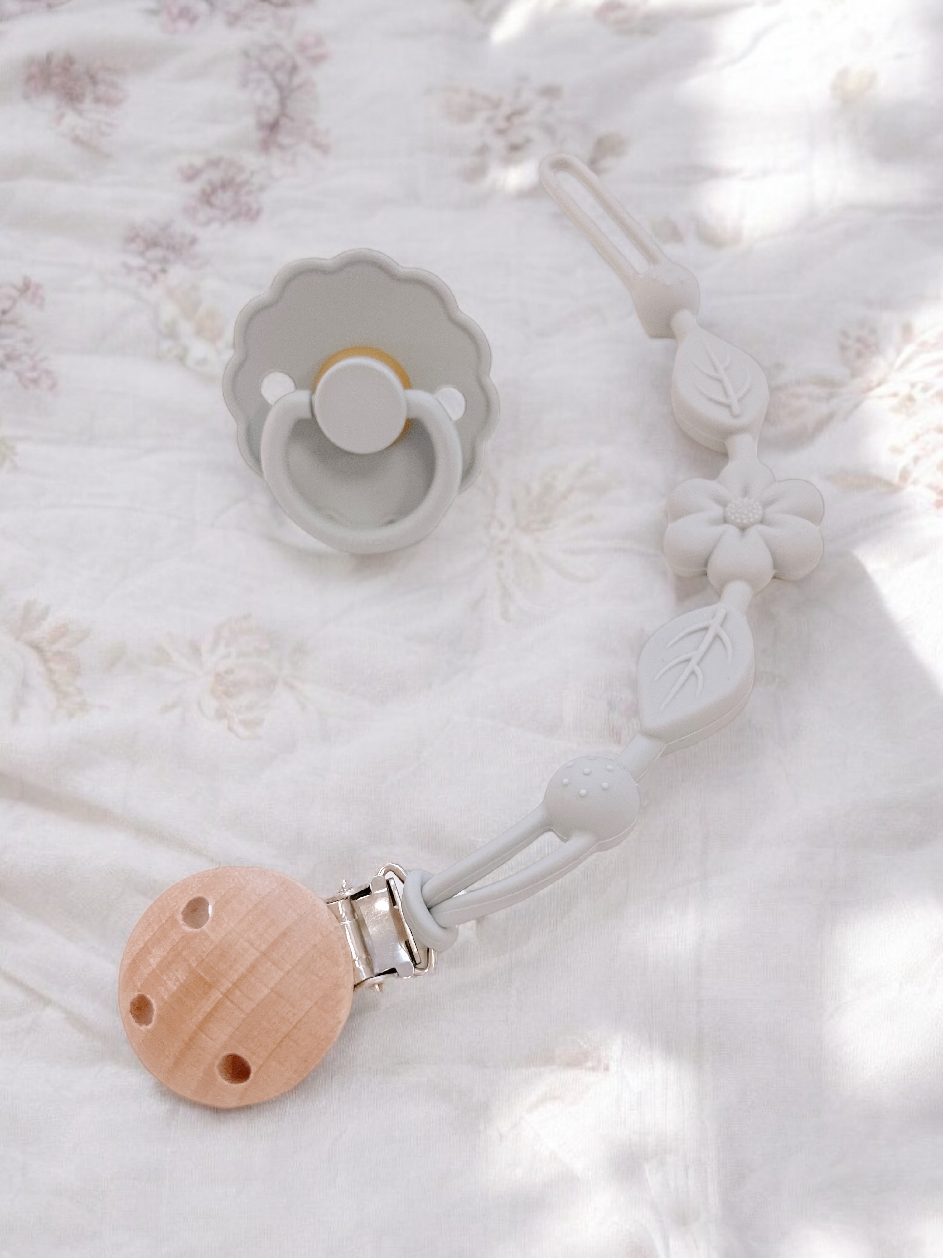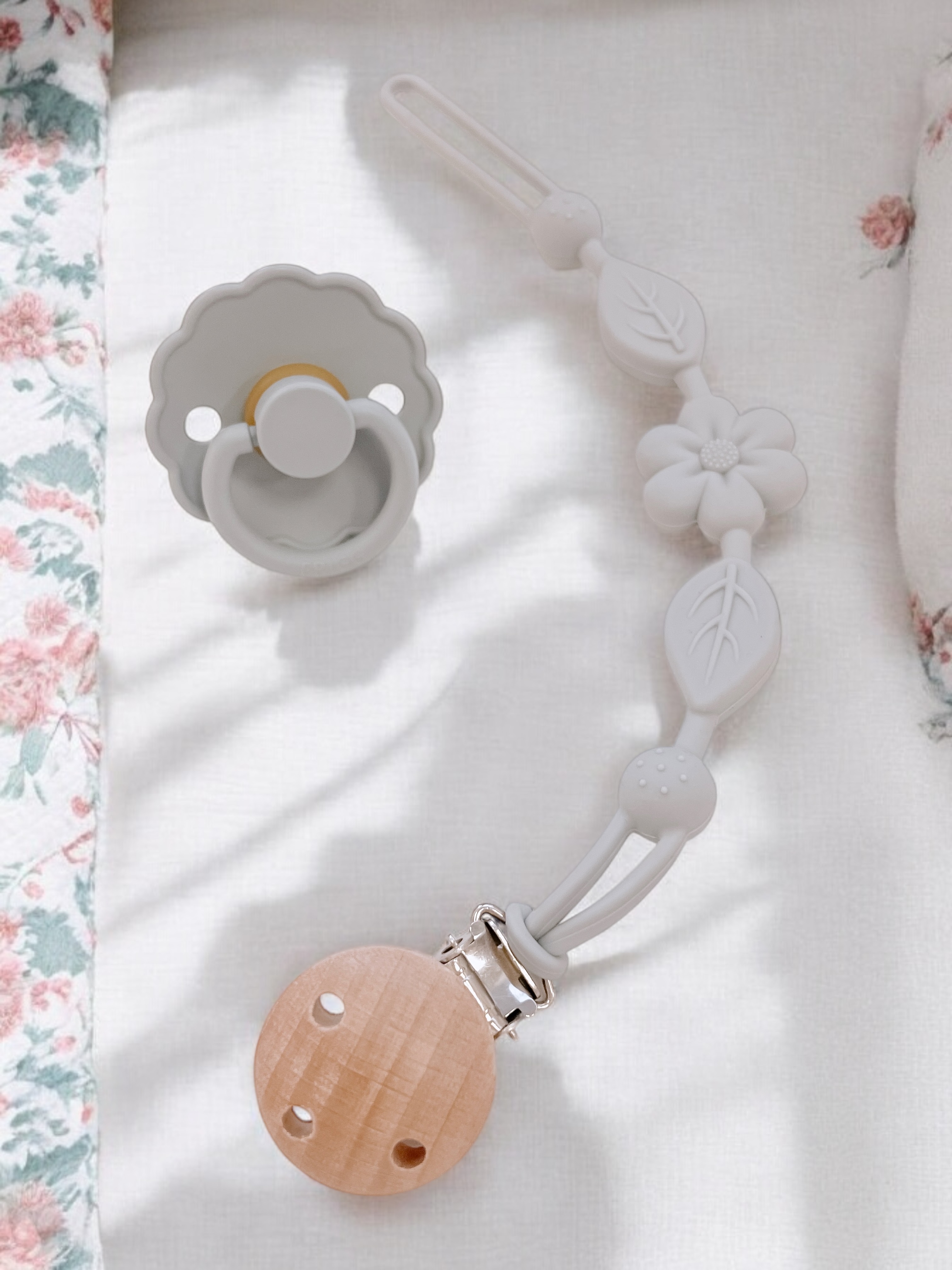 Smoczek Frigg Daisy charakteryzuje się falistą krawędzią która imituje płatki kwiatów nadając mu klasyczny i elegancki wygląd. Detale designu przyciągną wzrok każdej mamy dbającej o komfort i styl wybieranych produktów. Tarczka smoczka została lekko odgięta do zewnątrz, aby utrzymać ją z dala od delikatnej skóry dziecka. Posiada równierz otworki wentylacyjne zapewniające odpowiedni przepływ powietrza, zapobiegając potencjalnym podrażnieniom. Pełen uroku smoczek FRIGG Daisy jest dostępny w szerokiej gamie kolorystycznej.