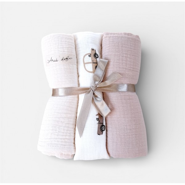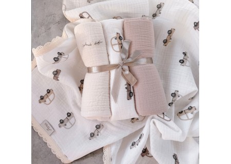 ZESTAW 3 SZT OTULACZY MUŚLINOWYCH BABY CARS (latte, pastelowy beż,AUTKA)