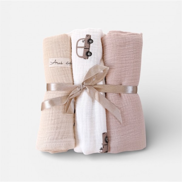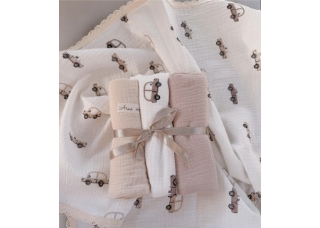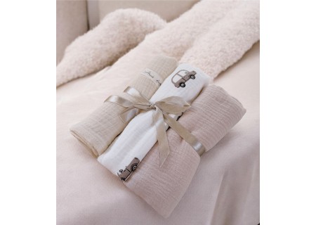 ZESTAW 3 SZT OTULACZY MUŚLINOWYCH baby cars (pastelowy beż, beż,autka)