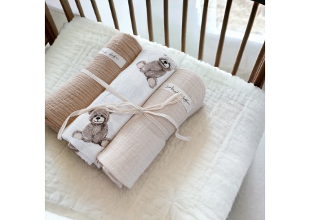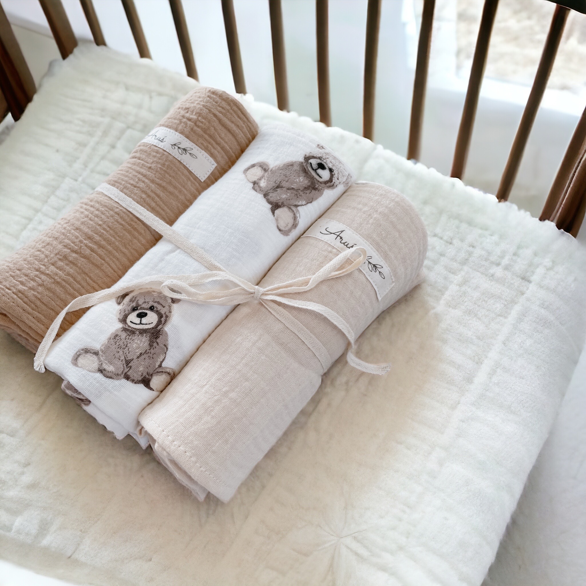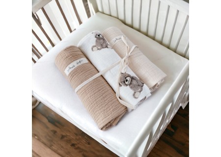 Otulacze wykonane w 100% z muślinu kreszowanego bawełnianego tzw doubble gauze. Tkaniny w 100% naturalne bawełniane, certyfikat Oeko-Tex Standard 100 i.
