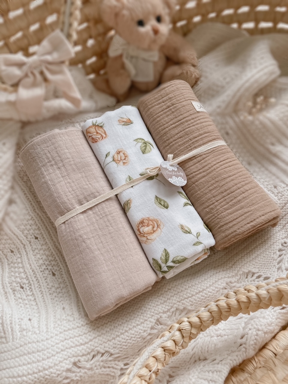 Otulacze wykonane w 100% z muślinu kreszowanego bawełnianego tzw doubble gauze. Tkaniny w 100% naturalne bawełniane, certyfikat Oeko-Tex Standard 100 i.