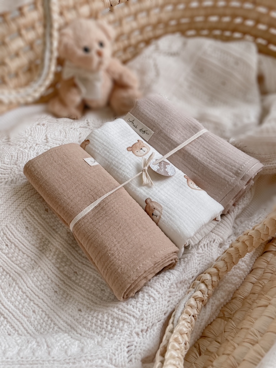 Otulacze wykonane w 100% z muślinu kreszowanego bawełnianego tzw doubble gauze. Tkaniny w 100% naturalne bawełniane, certyfikat Oeko-Tex Standard 100 i.