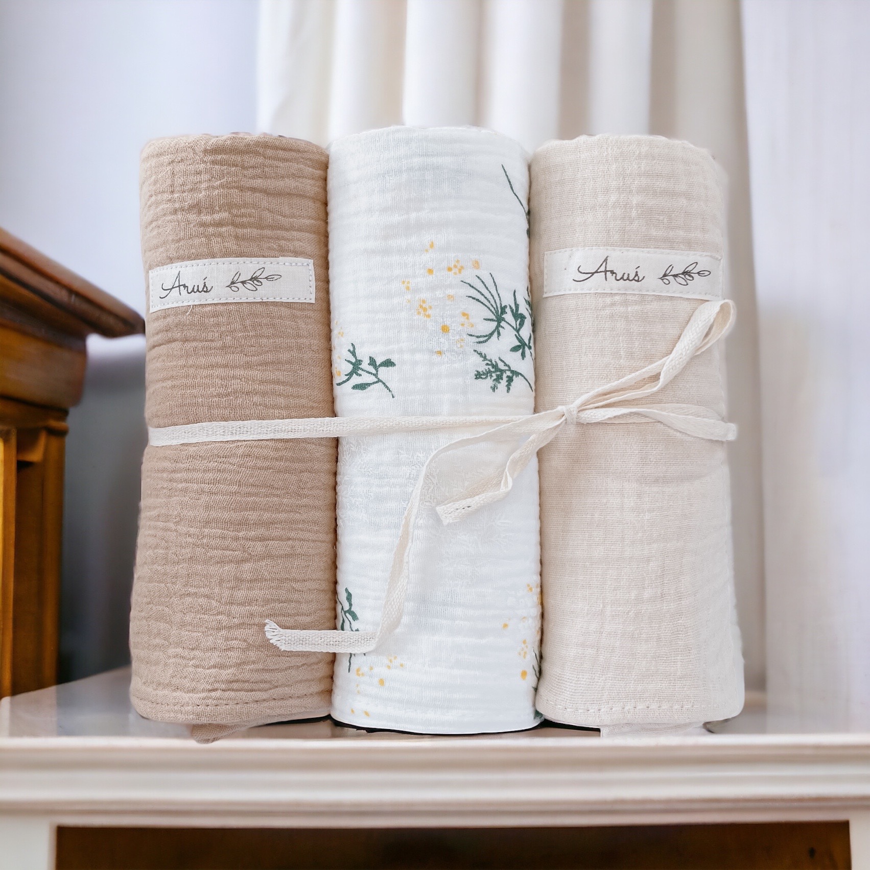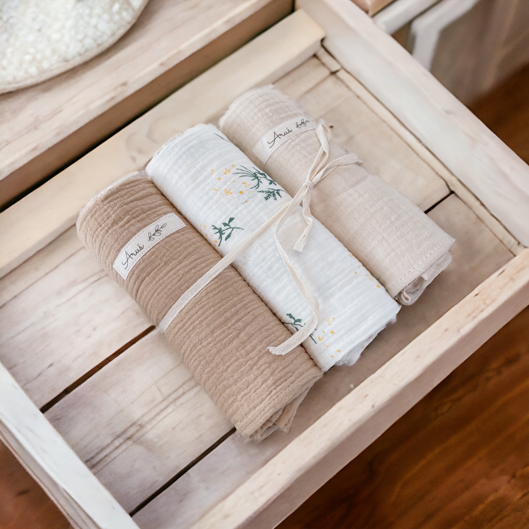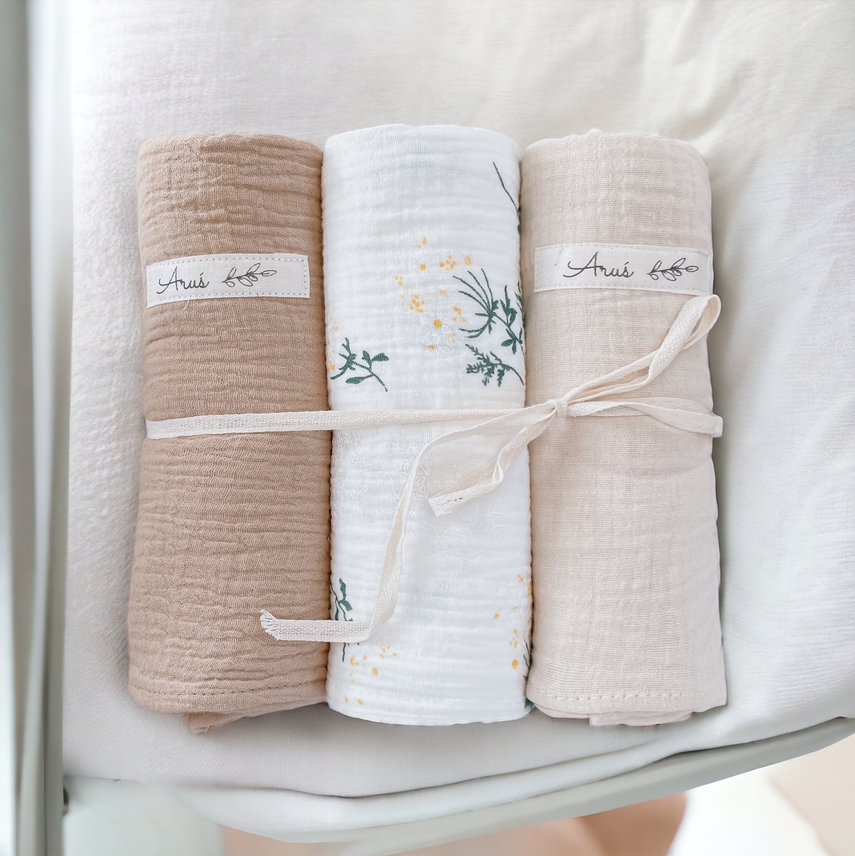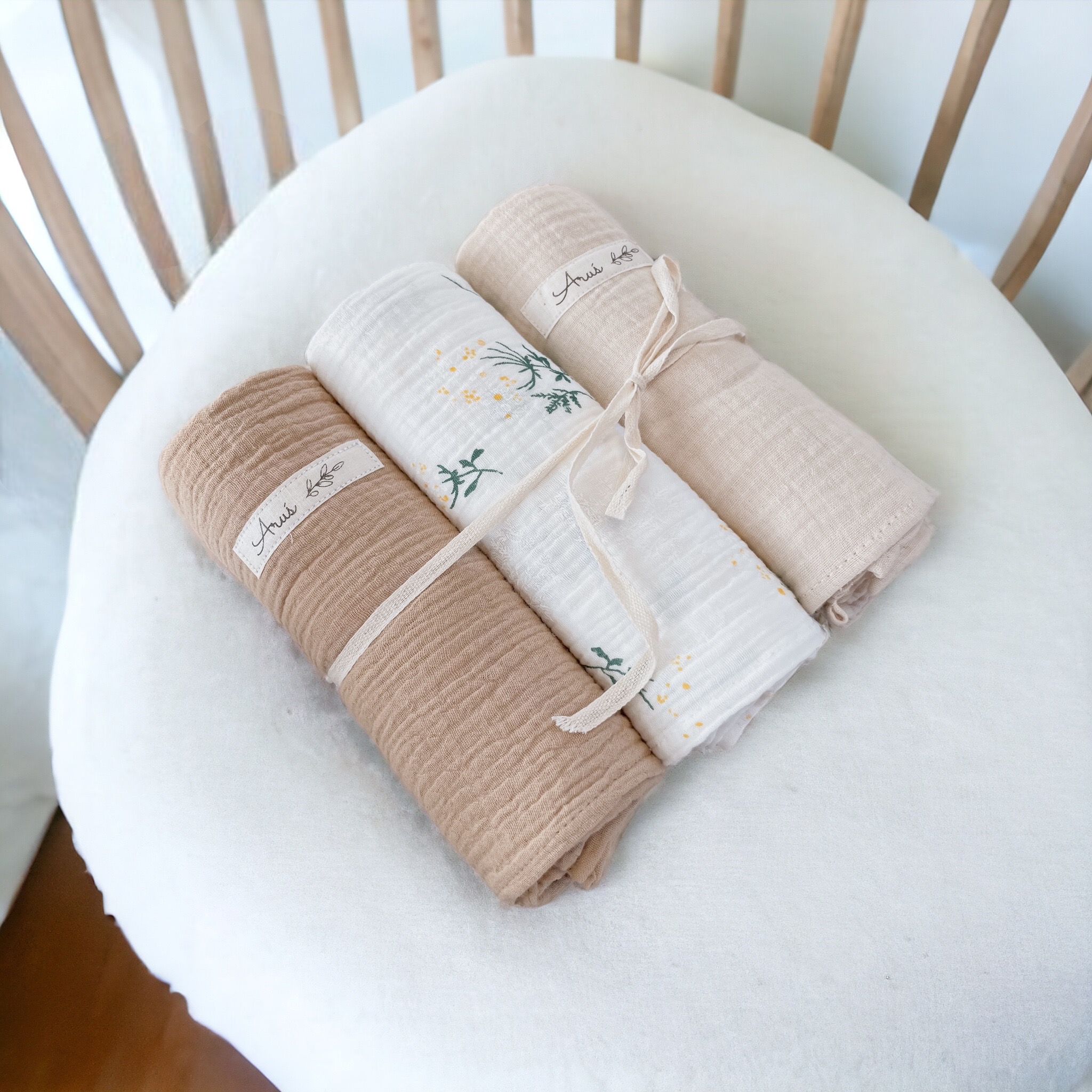 Otulacze wykonane w 100% z muślinu kreszowanego bawełnianego tzw doubble gauze. Tkaniny w 100% naturalne bawełniane, certyfikat Oeko-Tex Standard 100 i.