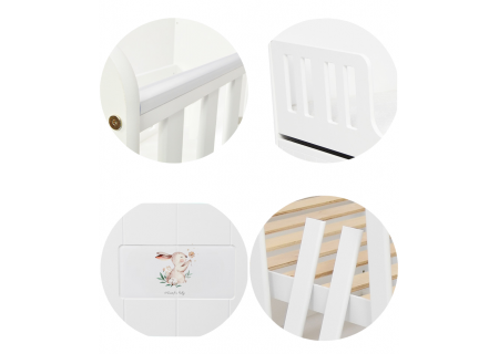 - Łóżeczko wykonane z drewna sosnowego oraz płyty ( wysoka jakość użytych materiałów )