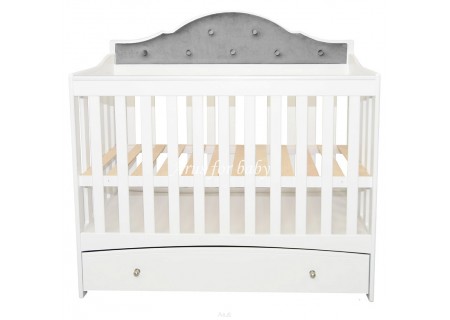 Od dołu szuflada na prowadnicach rolowych, idealna na wiele rzeczy maluszka, wykończona frontem z ozdobnym filunkiem pojawiającym się również na boku łóżeczka