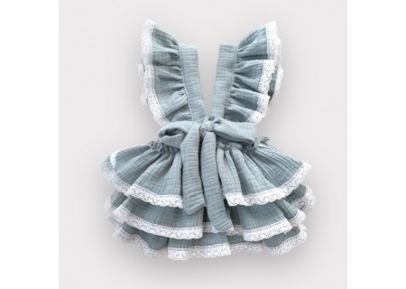 Spódniczka z trzech falban na szelkach, uszyta z bawełnianego muślinu, wiązana z tyłu na kokardkę .