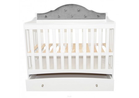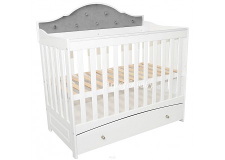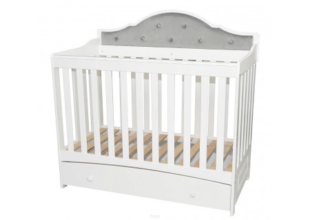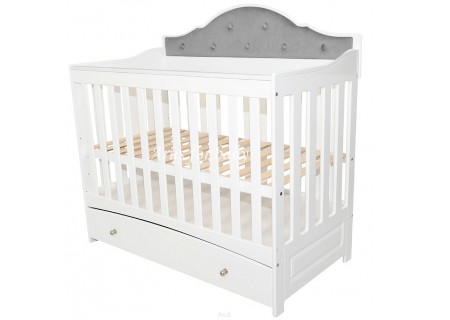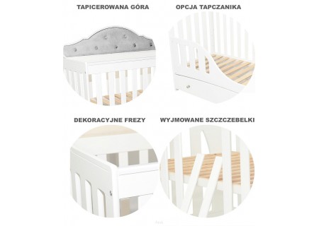 Od dołu szuflada na prowadnicach rolowych, idealna na wiele rzeczy maluszka, wykończona frontem z ozdobnym filunkiem pojawiającym się również na boku łóżeczka