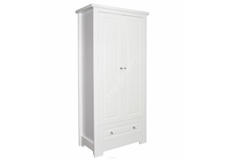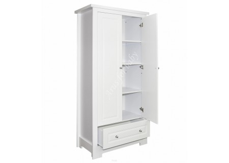 Wykonana w całości z płyty meblowej i płyty MDF w białym kolorze, góra szafy gruba, masywna