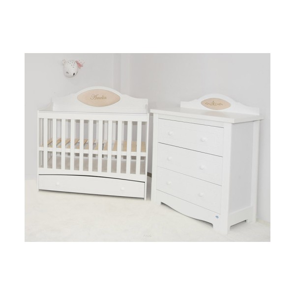 Komoda wykonana została w całości z płyty meblowej i płyty MDF w białym kolorze , stanowi idealna parę do łóżeczka Amelia