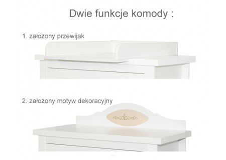 Na blacie komody można założyć znajdującą się w zestawie nakładkę ,która powoduje poszerzenie blaciku i stanowi funkcje przewijaka z ogranicznikami a co za tym wpływa na bezpieczne i swobodne przebieranie maluszka