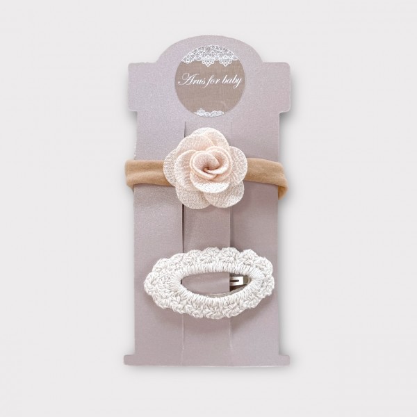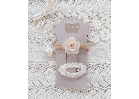 Zestaw opaska bezuciskowa + spinka Beżowa różyczka z koronką