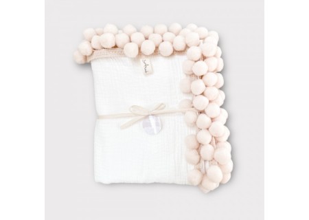 ♥ Kocyk Muślinowy 100x75 śmietankowy z beżowymi pomponami