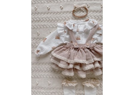 ♥ Spódnica/ bloomersy na szelkach z falbankami i koronką Lovely Line muślinowa pastelowy beż