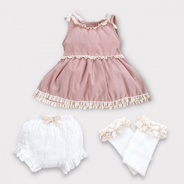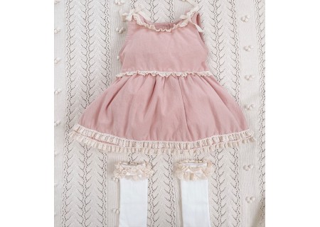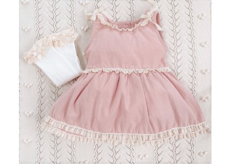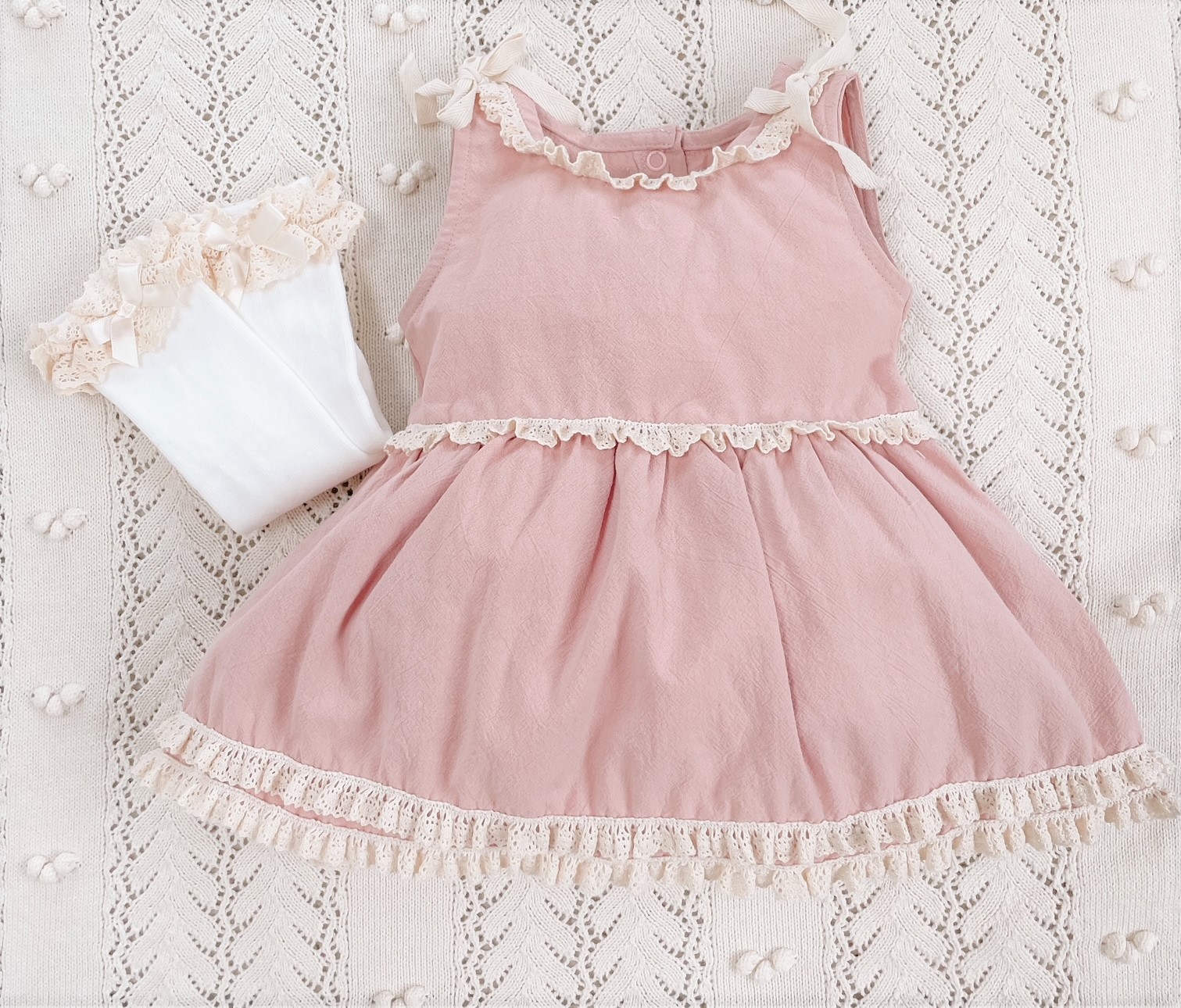 1. Sukienka bawełniana na ramiączkach ozdobiona koronkowymi falbankami w kolorze pudrowego różu.