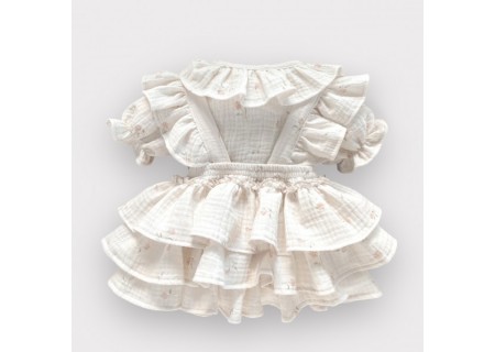 1. Spódniczka z trzech falban na szelkach uszyta z bawełnianego muślinu, wiązana z tyłu na kokardkę . Produkt posiada wszyte majteczki.