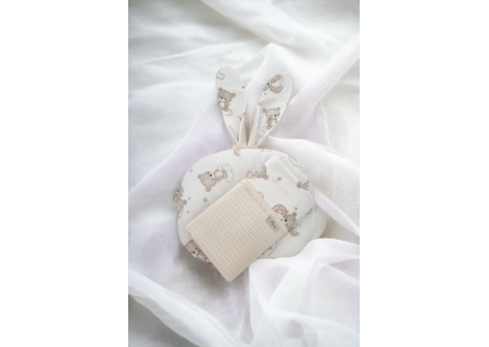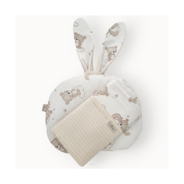 Do zestawu dolaczona jest plaska podusia z uszkami.. podusia wykonana z tkaniny wafelek + tkanina bawełniana
